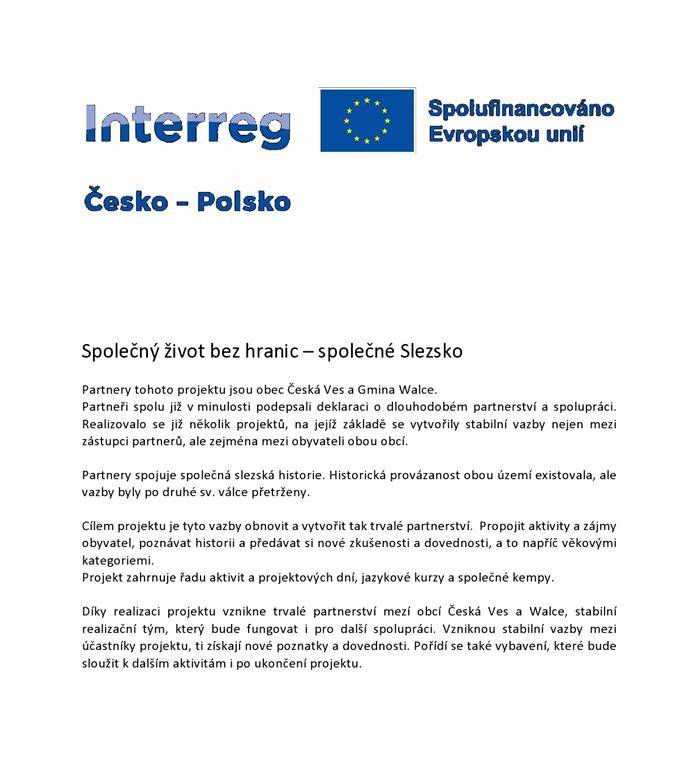 Společný život bez hranic - společné SlezskoPartnery tohoto projektu jsou obec Česká Ves a Gmina Walce. Partneři spolu již v minulosti podepsali deklaraci o dlouhodobém partnerství a spolupráci. Realizovalo se již několik projektů, na jejíž základě se vytvořily stabilní ... (více) |